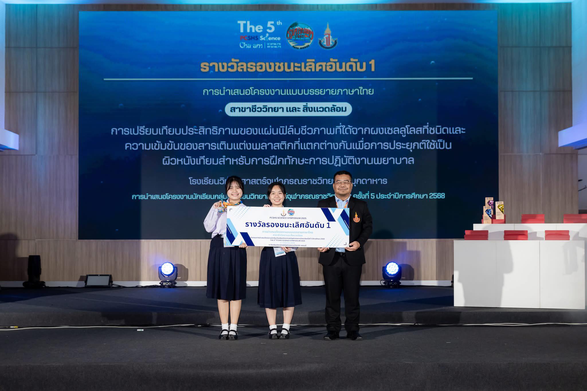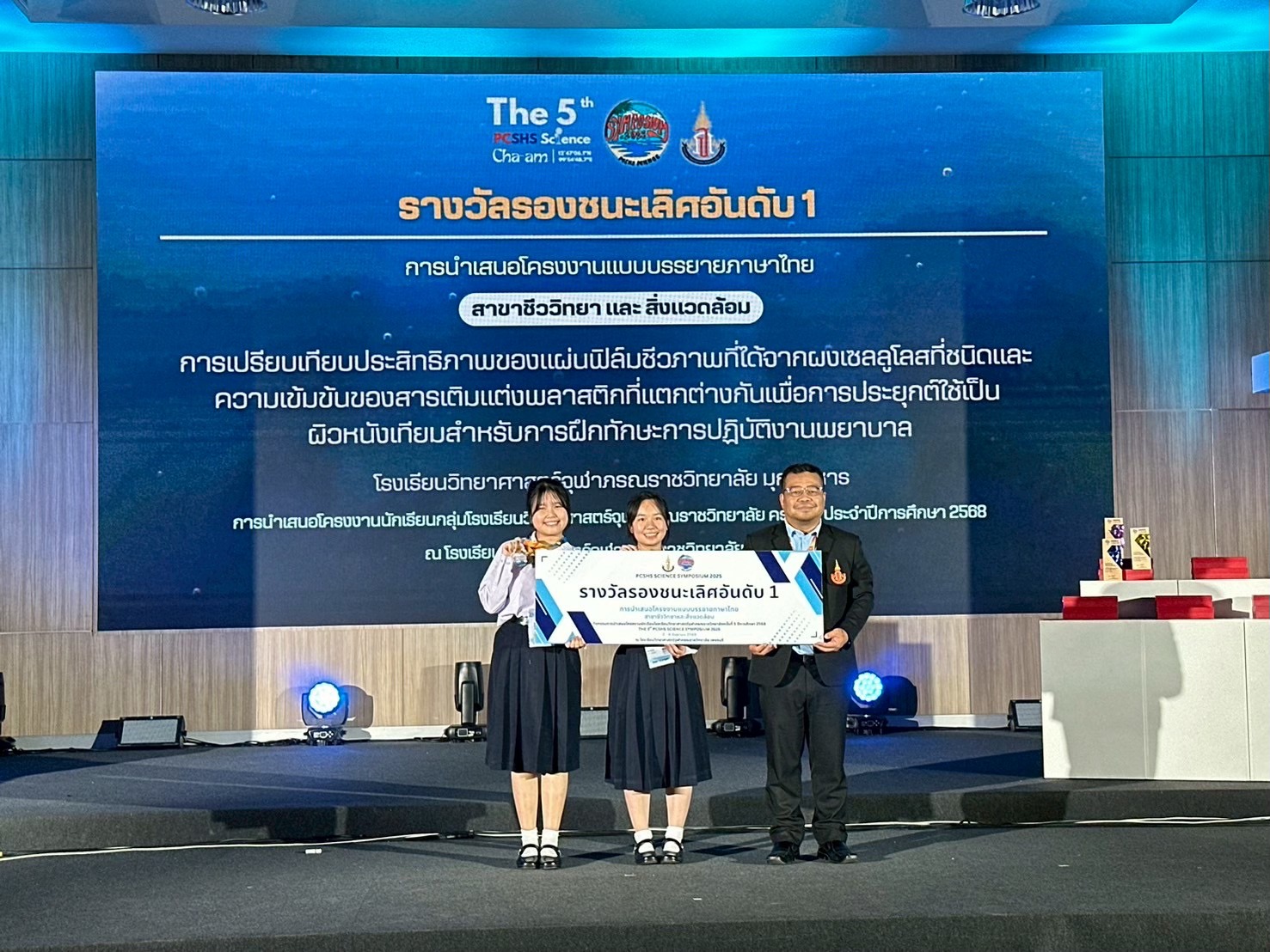- รองชนะเลิศอันดับหนี่ง เหรียญทอง Thai Oral Presentation สาขาชีววิทยาโครงงานเรื่อง การเปรียบเทียบประสิทธิภาพของแผ่นฟิล์มชีวภาพที่ได้จากผงเซลลูโลสสำเร็จรูปที่ชนิดและความเข้มข้นของสารเติมแต่งพลาสติกต่างกันเพื่อการประยุกต์ใช้เป็นหนังเทียมสำหรับฝึกทักษะการปฏิบัติงานพยาบาล ผู้พัฒนางาน