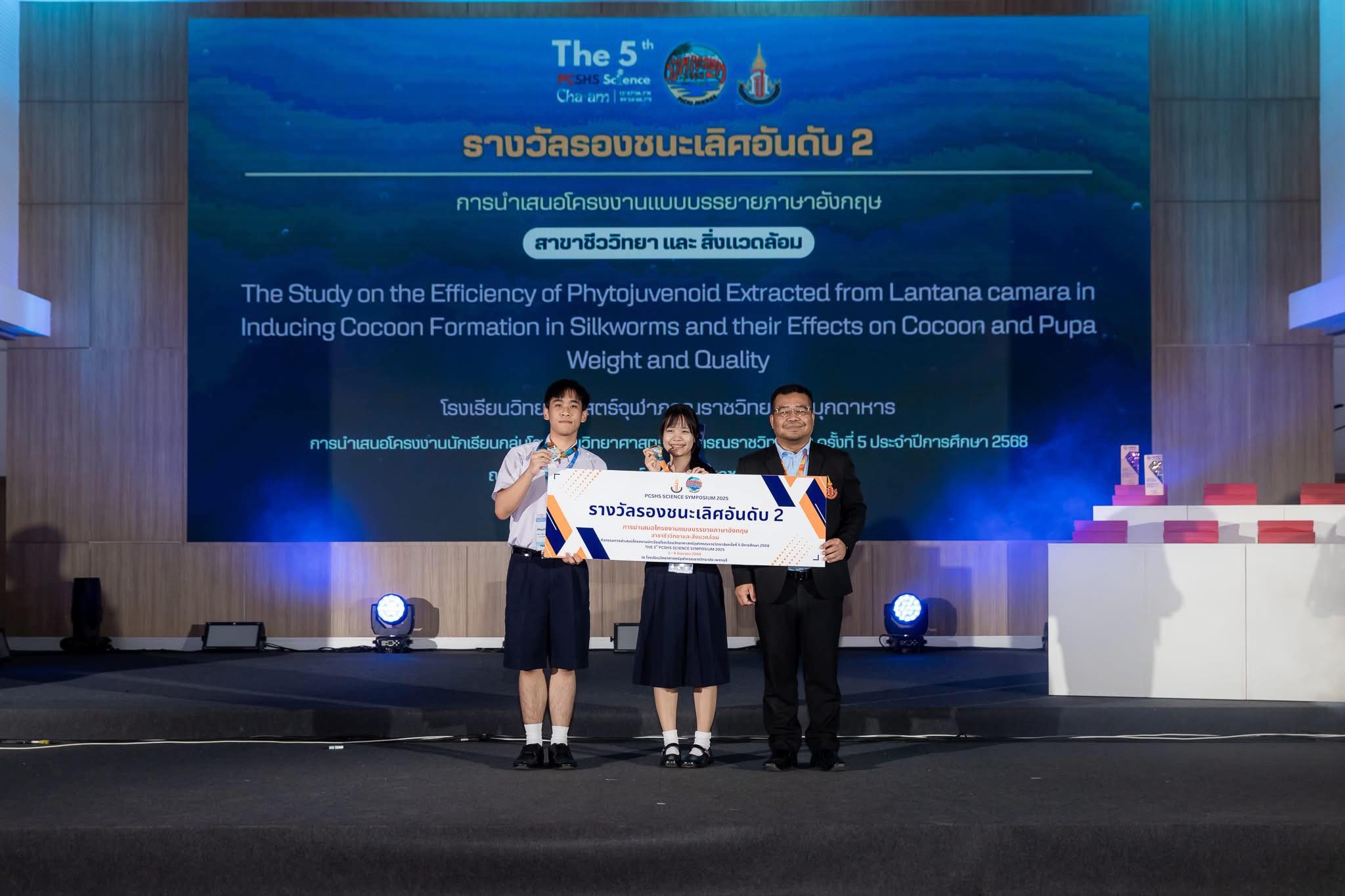 - รองชนะเลิศอันดับสอง เหรียญทอง English Oral Presentation สาขาชีววิทยา โครงงานเรื่อง การศึกษาประสิทธิภาพของสารคล้ายจูวีไนล์ฮอร์โมนที่สกัดจากต้นผกากรอง(Lantana camara) ที่มีผลต่อการเหนี่ยวนำการสร้างรังของหนอนไหม รวมไปถึงผลที่มีต่อการเพิ่มน้ำหนักและคุณภาพของรังไหมและดักแด้ ผู้พัฒนางาน