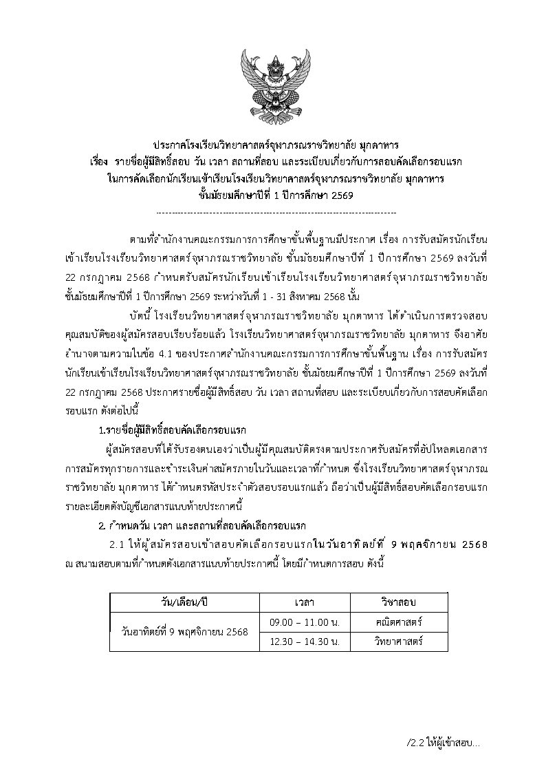 ประกาศรายชื่อผู้มีสิทธิ์สอบเข้า ม.1 ปีการศึกษา 2569(รอบแรก)