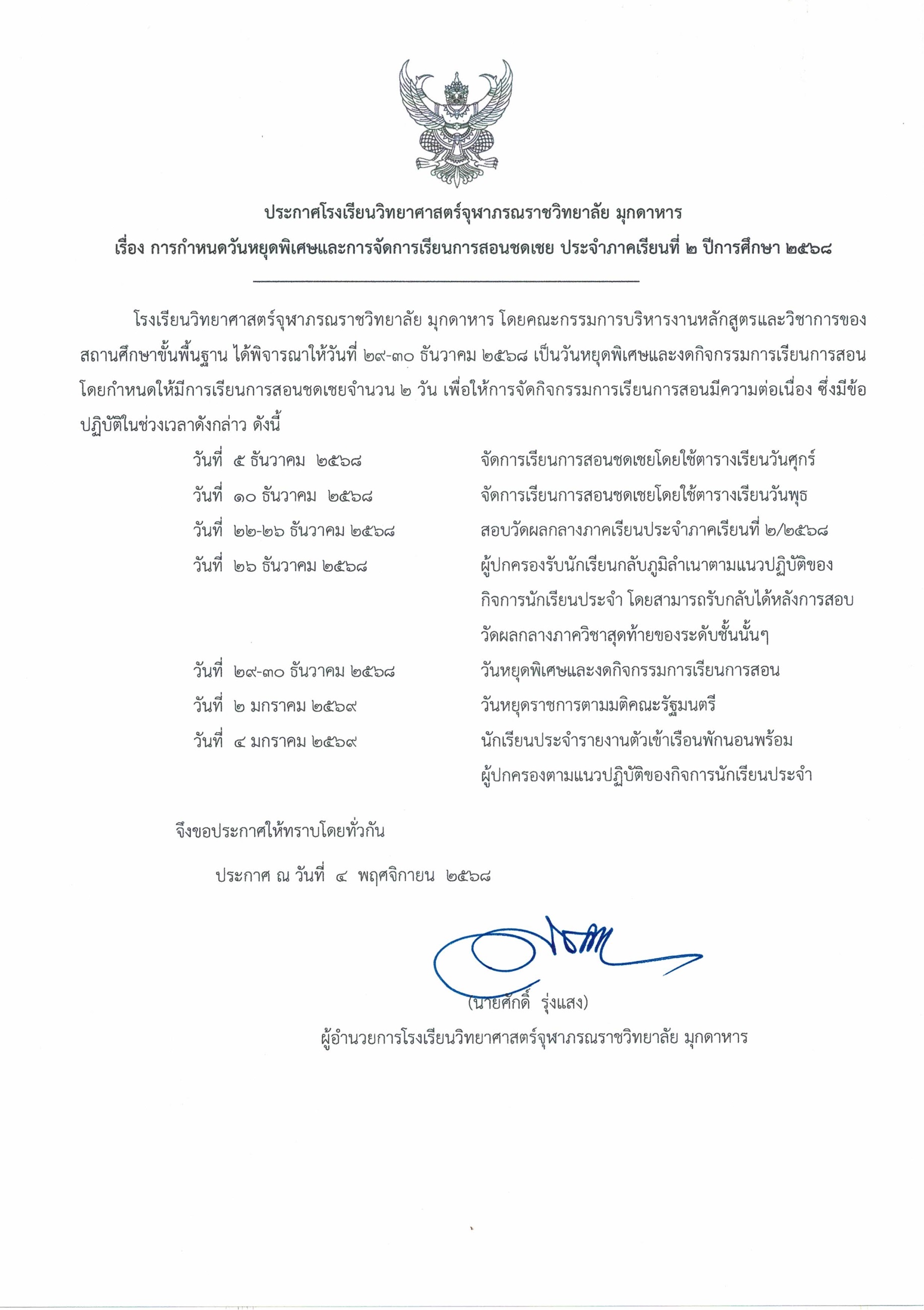 ประกาศกำหนดวันหยุดพิเศษและการจัดการเรียนการสอนชดเชย ภาคเรียนที่ 2 ปีการศึกษา 2568