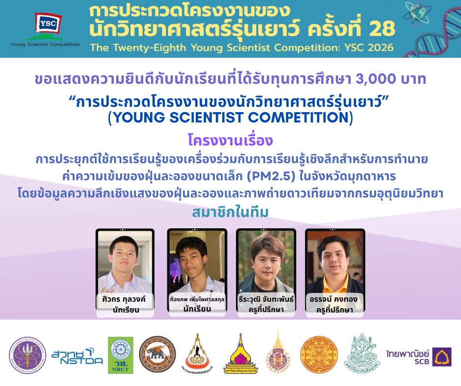 แสดงความยินดีกับนักเรียนโรงเรียนวิทยาศาสตร์จุฬาภรณราชวิทยาลัย มุกดาหาร ที่ผ่านการคัดเลือกเข้าร่วม โครงการประกวดโครงงานของนักวิทยาศาสตร์รุ่นเยาว์ ครั้งที่ 28 (YSC 2026) รอบข้อเสนอโครงการ ศูนย์ประสานงานภาคตะวันออกเฉียงเหนือ มหาวิทยาลัยอุบลราชธานี โดยมีโครงงานวิทยาศาสตร์ ทั้งสิ้น 13 โครงงานที่จะได้รับทุนพัฒนาโครงงาน จำนวน 3,000 บาท และมีสิทธิ์เข้าแข่งขันเพื่อชิงตั๋ว เข้าร่วมแข่งขัน เวที Regeneron ISEF ณ ประเทศสหรัฐอเมริกา ในปี 2026 นอกจากนี้ ขอแสดงความยินดีกับ 28 โครงงานวิทยาศาสตร์ ที่ได้รับเกียรติบัตรผ่านเกณฑ์การประเมินรอบข้อเสนอ (YSC 2026)