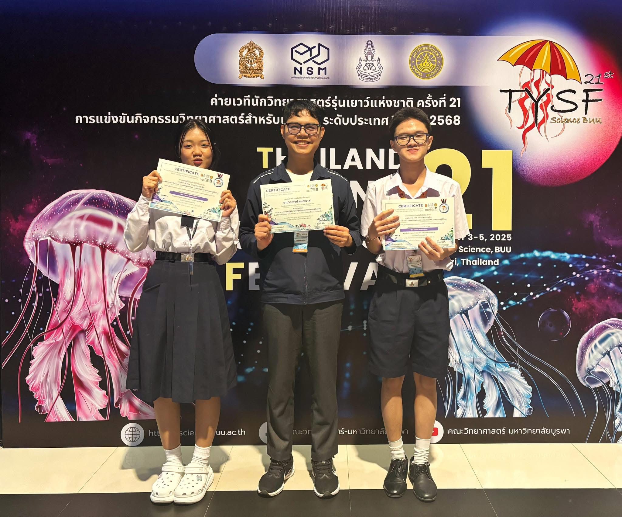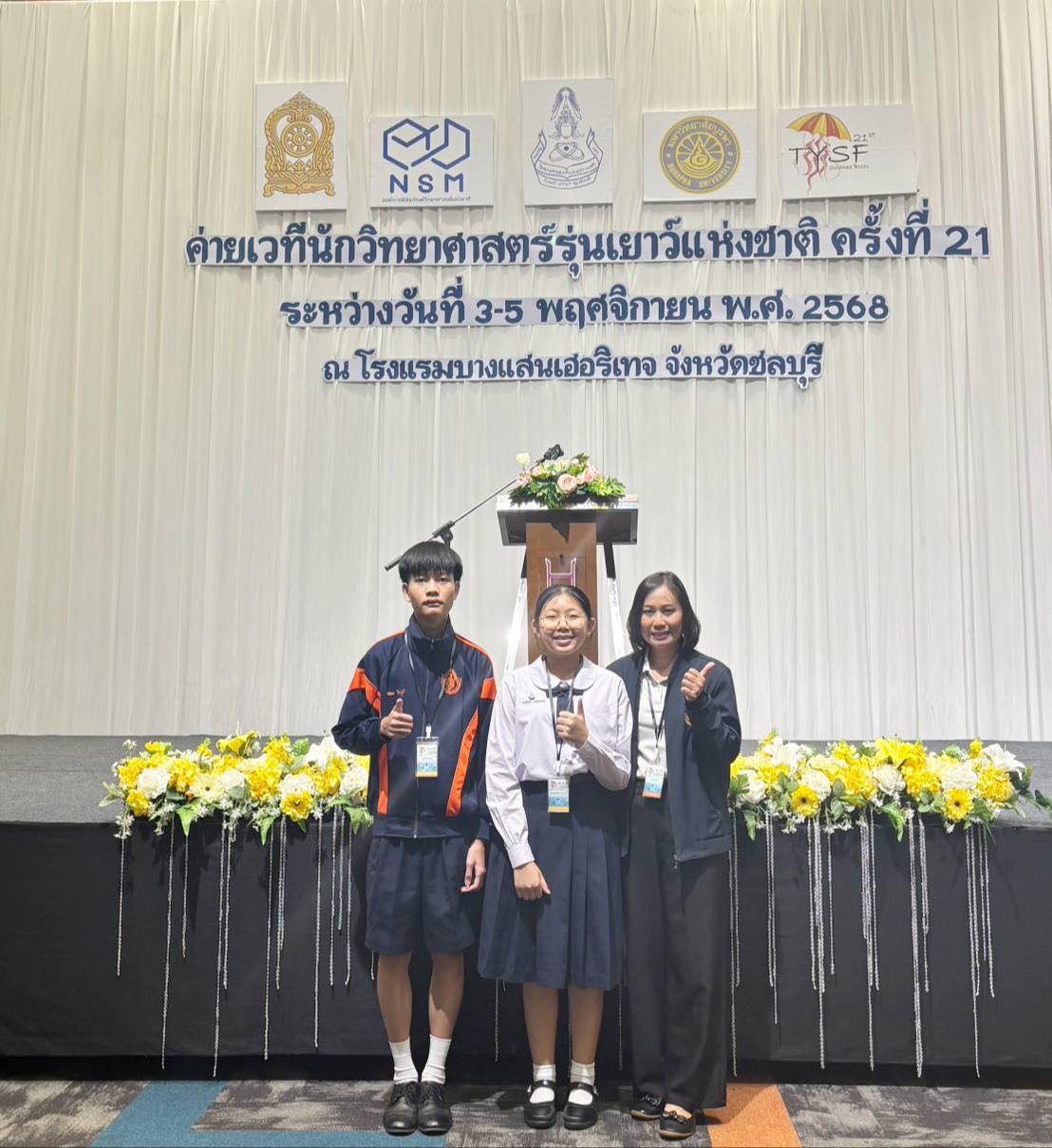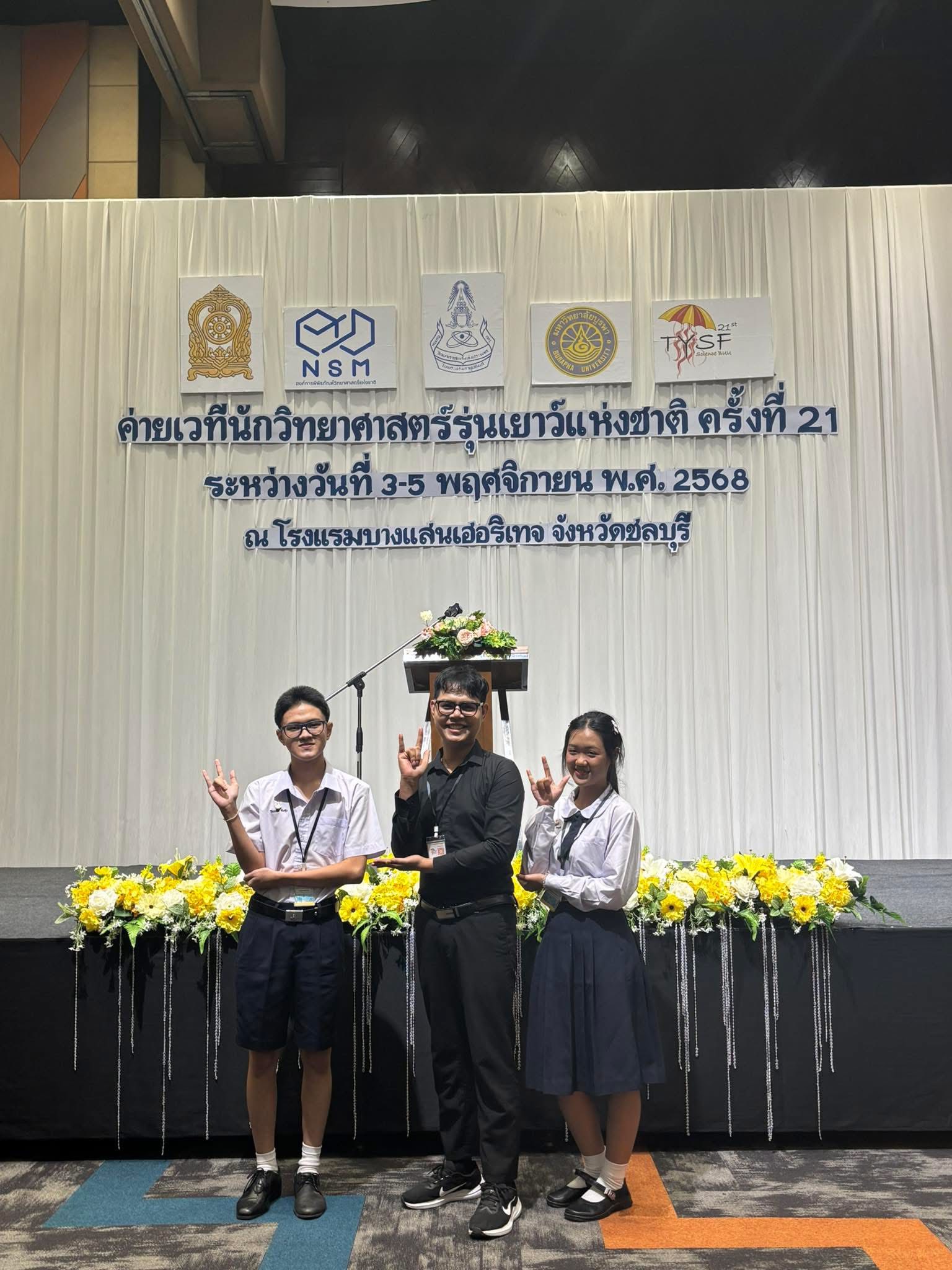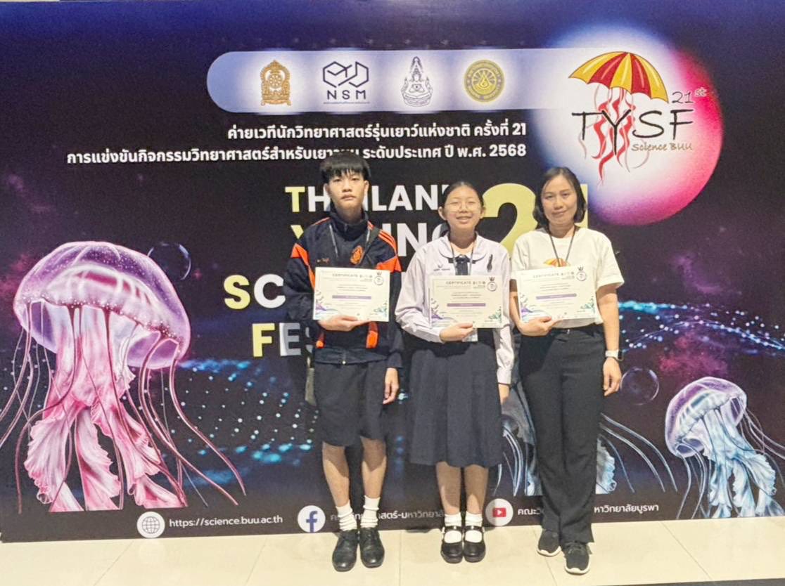 แสดงความยินดีกับนักเรียนที่ได้รับรางวัลจากการแข่งขันระดับประเทศ เวทีนักวิทยาศาสตร์รุ่นเยาว์ ครั้งที่ 21 โดยสมาคมวิทยาศาสตร์แห่งประเทศไทย ประจำปี พ.ศ. 2568 ระหว่างวันที่ 3-4 พฤศจิกายน 2568 ณ คณะวิทยาศาสตร์ มหาวิทยาลัยบูรพา โดยมีผลงานได้รับรางวัล ดังนี้