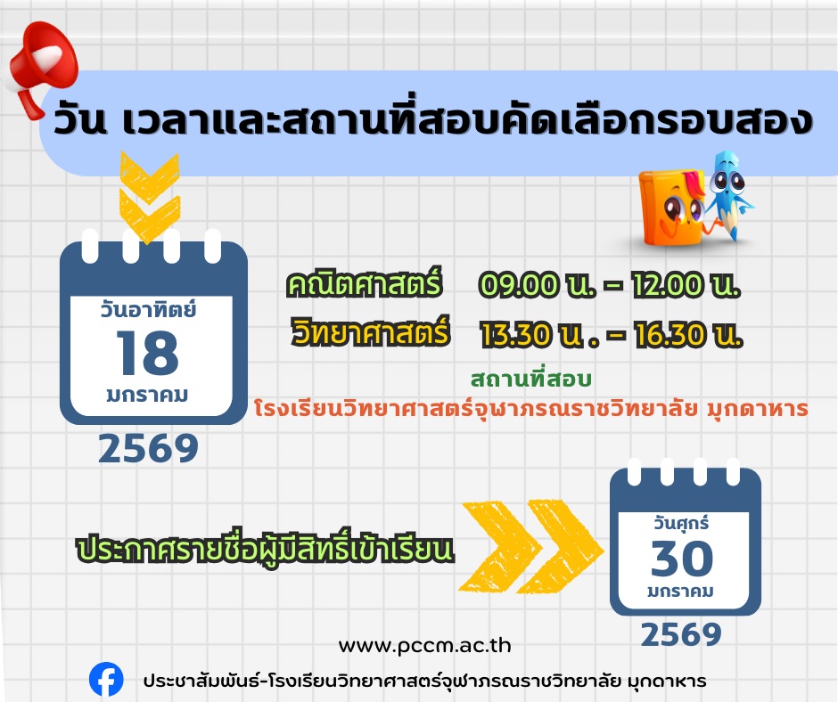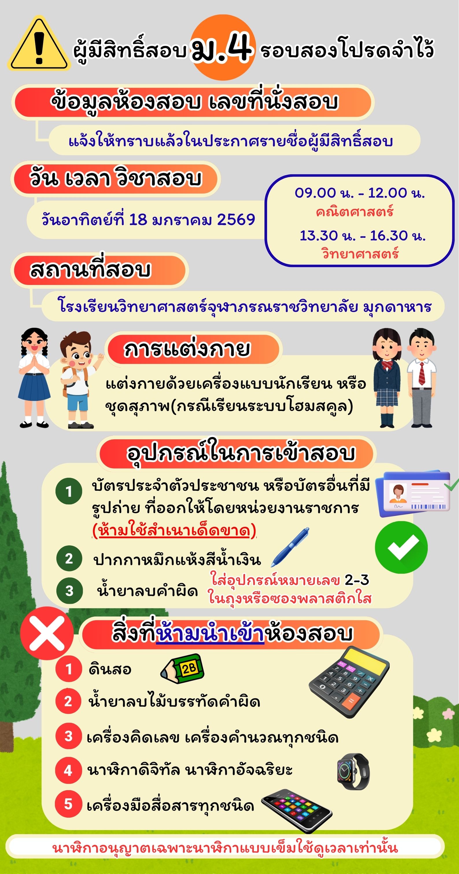 โรงเรียนวิทยาศาสตร์จุฬาภรณราชวิทยาลัย มุกดาหาร ประกาศรายชื่อผู้มีสิทธิ์สอบคัดเลือกรอบสอง เพื่อเข้าศึกษาต่อชั้นมัธยมศึกษาปีที่ 4 ปีการศึกษา 2569 โดยมีจำนวนผู้มีสิทธิ์สอบรวม 500 คน (รายชื่อเรียงตามตัวอักษรชื่อ-สกุล) ขอให้ผู้ปกครองและนักเรียนตรวจสอบรายชื่อและเตรียมตัวสอบตามรายละเอียดสำคัญดังต่อไปนี้