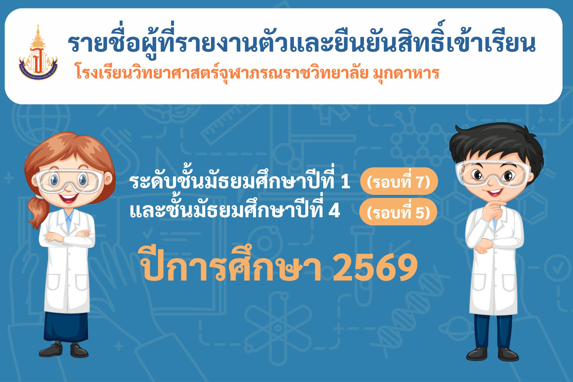 ประกาศรายชื่อผู้ที่รายงานตัวและยืนยันสิทธิ์การเข้าเรียน โรงเรียนวิทยาศาสตร์จฬาภรณราชวิทยาลัย มุกดาหาร ระดับชั้น มัธยมศึกษาปีที่ 1(รอบที่ 7) และ ชั้นมัธยมศึกษาปีที่ 4(รอบที่ 5) ปีการศึกษา 2569