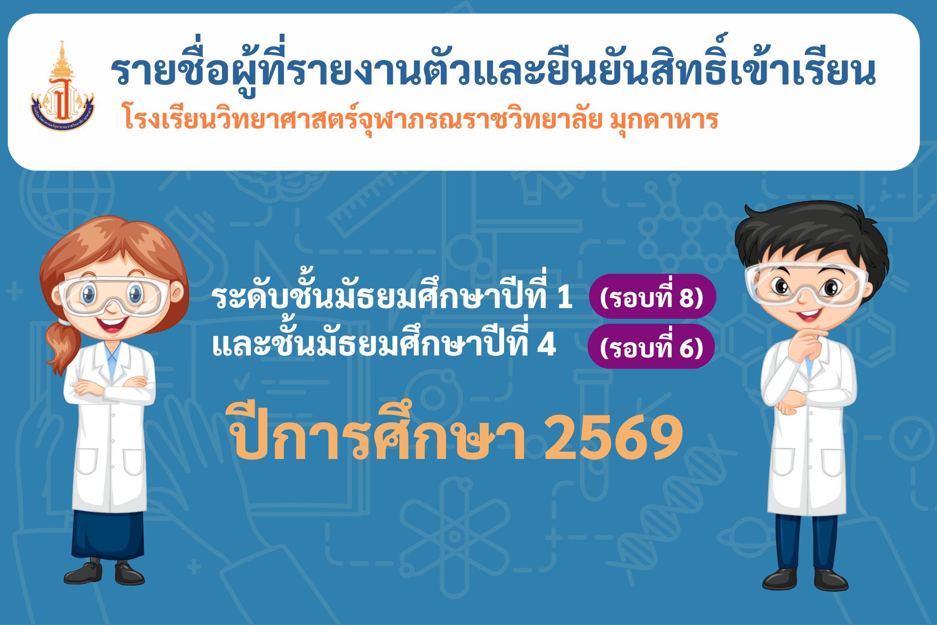 ประกาศรายชื่อผู้ที่รายงานตัวและยืนยันสิทธิ์การเข้าเรียน โรงเรียนวิทยาศาสตร์จฬาภรณราชวิทยาลัย มุกดาหาร ระดับชั้น มัธยมศึกษาปีที่ 1(รอบที่ 8) และ ชั้นมัธยมศึกษาปีที่ 4(รอบที่ 6) ปีการศึกษา 2569