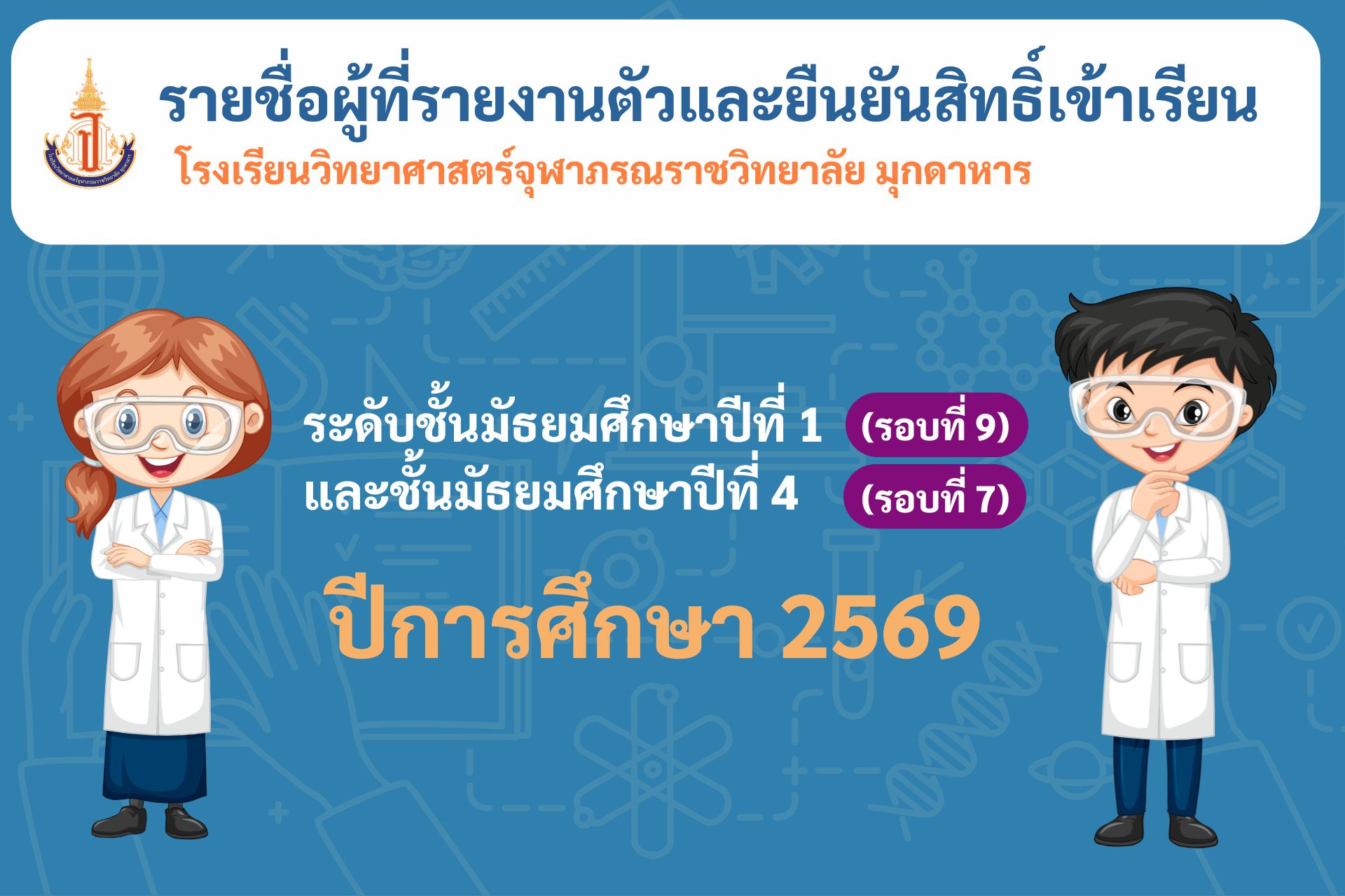 ประกาศรายชื่อผู้ที่รายงานตัวและยืนยันสิทธิ์การเข้าเรียน โรงเรียนวิทยาศาสตร์จฬาภรณราชวิทยาลัย มุกดาหาร ระดับชั้น มัธยมศึกษาปีที่ 1(รอบที่ 9) และ ชั้นมัธยมศึกษาปีที่ 4(รอบที่ 7) ปีการศึกษา 2569
