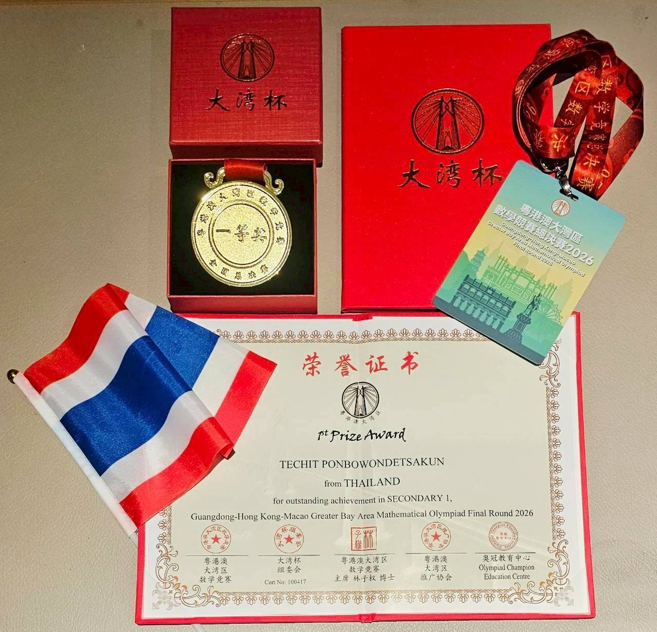 โรงเรียนวิทยาศาสตร์จุฬาภรณราชวิทยาลัย มุกดาหาร ขอแสดงความยินดีกับนักเรียน โรงเรียนวิทยาศาสตร์จุฬาภรณราชวิทยาลัย มุกดาหารเด็กชาย เตชิต พลบวรเดชสกุล นักเรียนชั้นมัธยศึกษาปีที่ 1 ได้รับรางวัลที่ 1 การแข่งขันคณิตศาสตร์โอลิมปิก ณ ประเทศฮ่องกง ในวันที่ 14 มีนาคม 2569 ในการเข้าการแข่งขัน GuangdongHong Kong-Macao Greater Bay Area Mathematical Olympiad Big Bay Bei FINAL 2026 ดำเนินการโดย Olympiad Champion Education Center (OCEC) ประเทศฮ่องกง